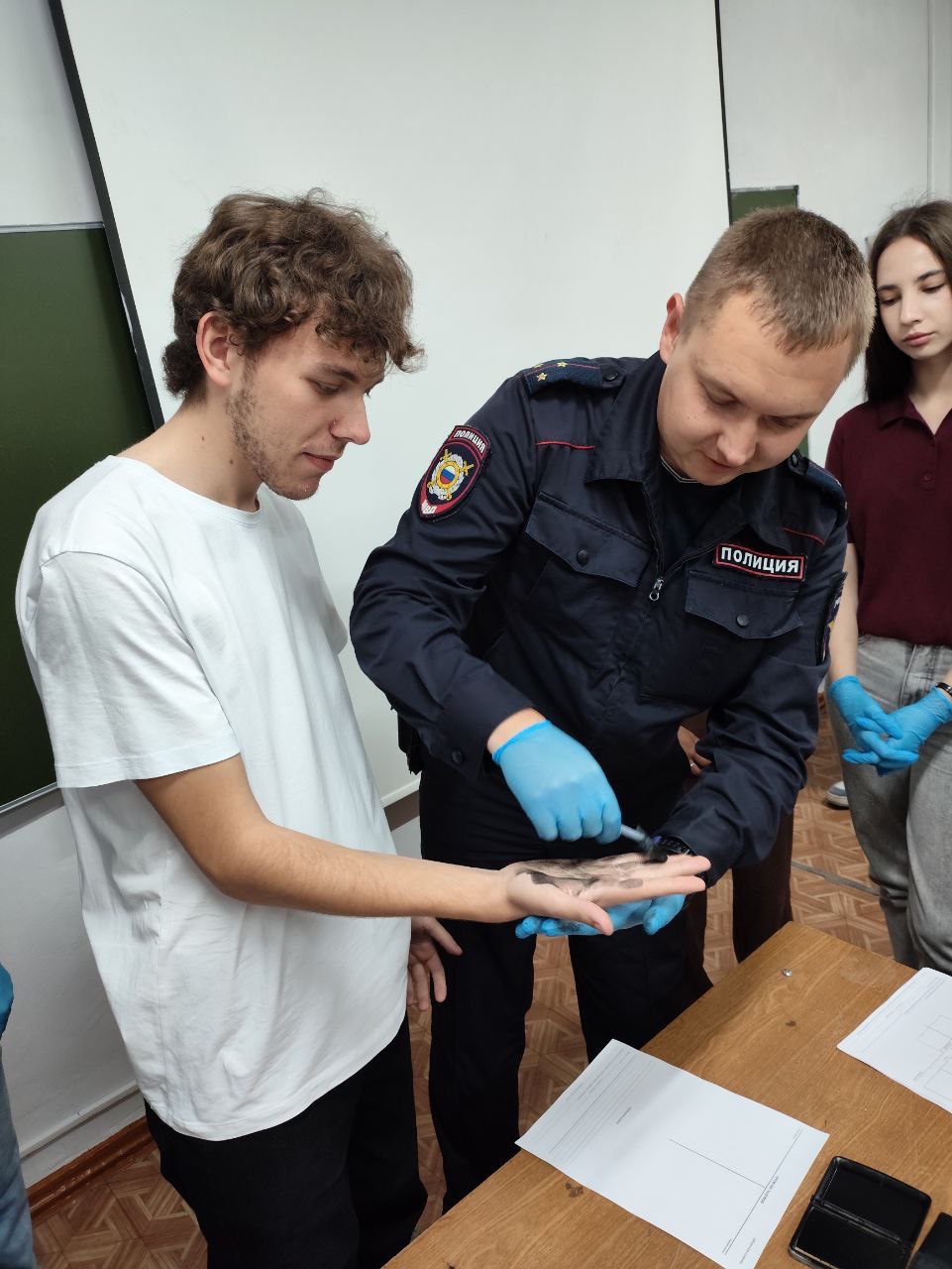 Старший лейтенант полиции Шинкарецкий Сергей Петрович провел мастер-класс по использованию дактилоскопии в расследовании преступлений. Мастер-класс вызвал у студентов неподдельный интерес. Обучающиеся с большим интересом изучали виды попилярных узоров и сравнивали с собственными ладонями.