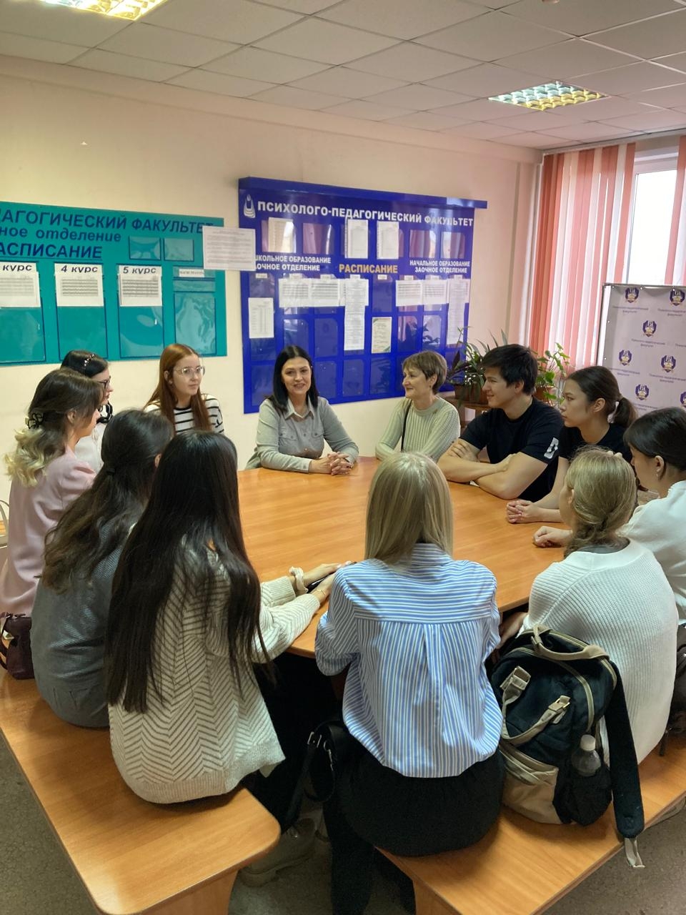 11-классники на один день стали самыми настоящими студентами. Декан психолого-педагогического факультета И.В. Чикова и доцент кафедры Э.Р. Минибаева провели экскурсию по учебному корпусу.