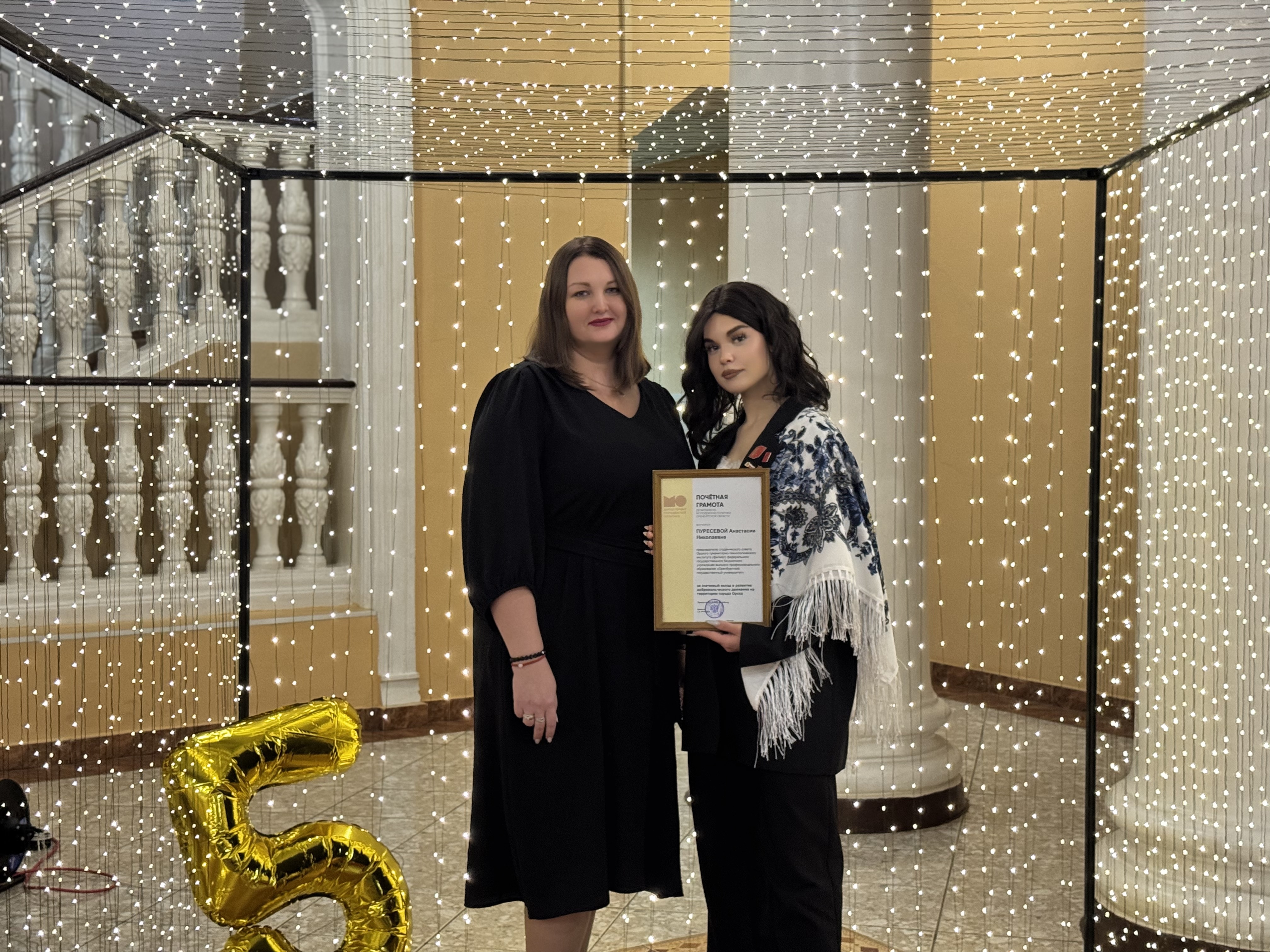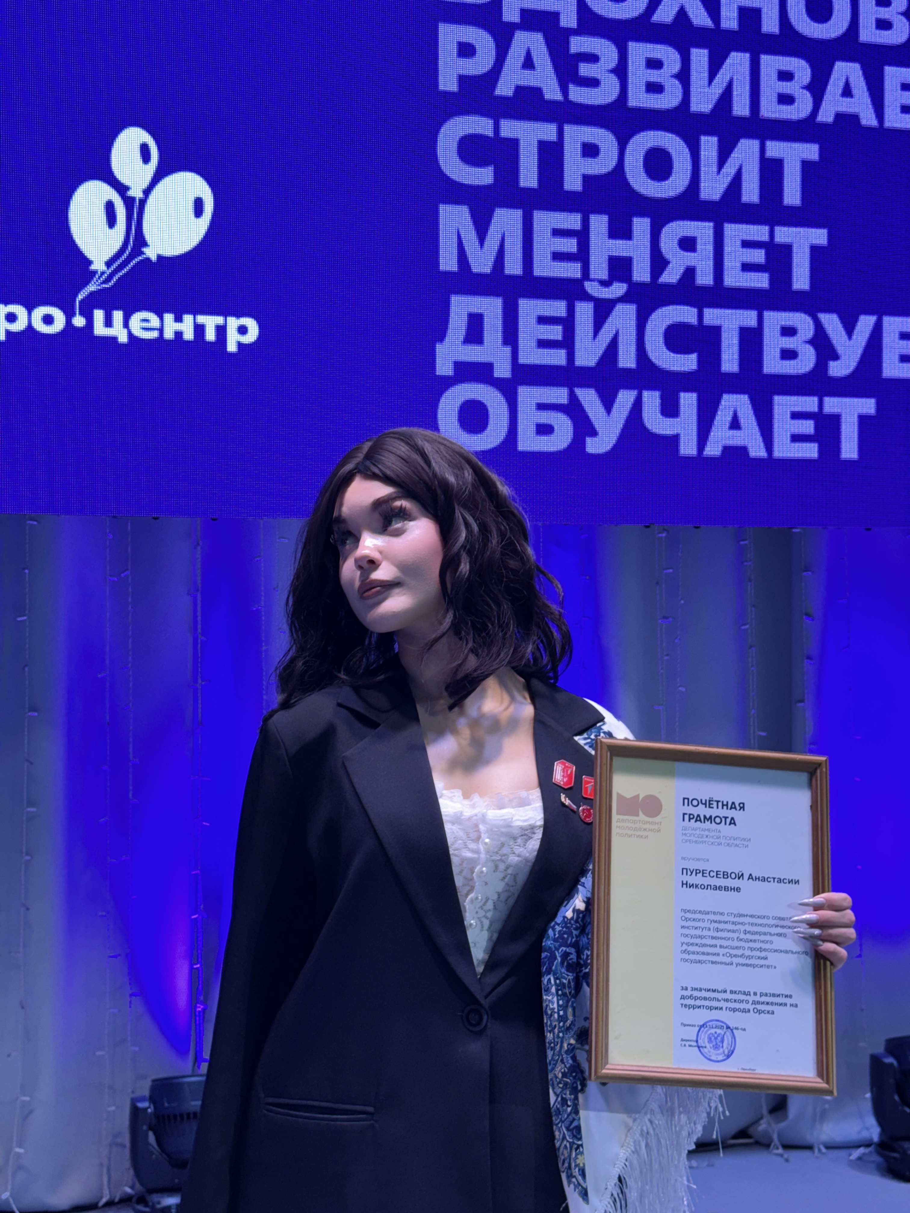 Председатель студенческого совета Орского гуманитарно-технологического института (филиала) ОГУ, студентка группы 24ПО(б)РЯЛ Анастасия Пуресева отмечена почётной грамотой Департамента молодёжной политики Оренбургской области за значимый вклад в развитие добровольческого движения на территории г. Орска.